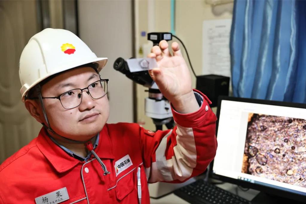 圖為塔里木油田勘探開發研究院基礎研究部觀察巖屑磨出來的巖石薄片。