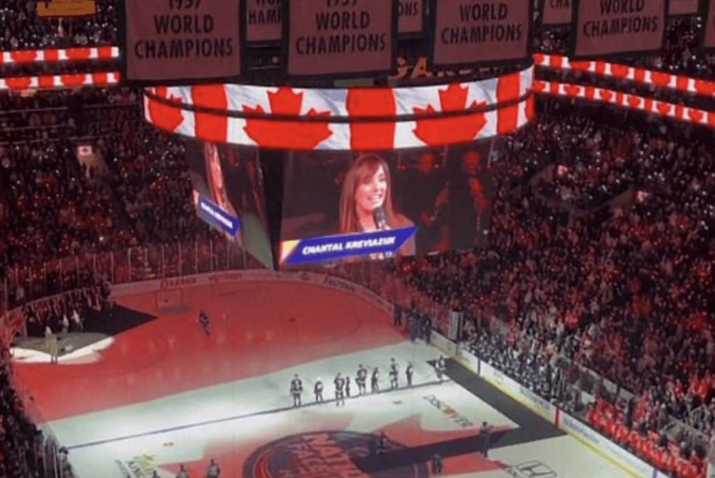 ▲加拿大著名女歌手香岱兒在四國冰球賽現場演唱加國國歌《O Canada》時,刻意修改歌詞,藉此向特朗普還擊。