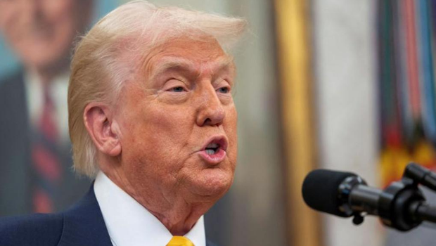 美國總統特朗普2月21日在白宮橢圓形辦公室發表談話的神情。