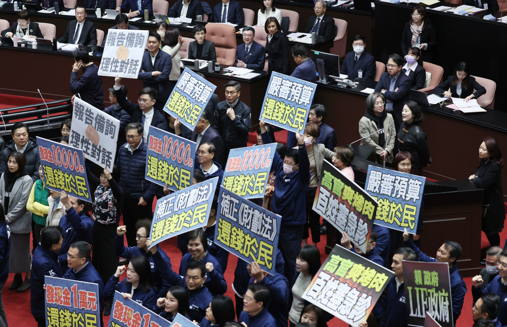 國民黨“立委”手持“嚴審預算,還錢于民”等標語抗議。