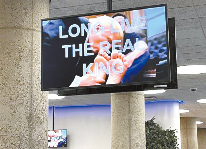 住房和城市發展部的員工餐廳電視,播出一段偽造的特朗普吻馬斯克臭腳視頻,特朗普吻馬斯克臭腳,鏡頭前寫著“真正的國王萬歲”的字樣。 視頻截圖