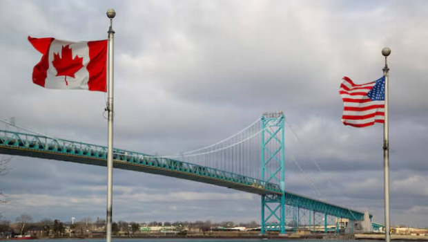 ▲圖為連接美國與加拿大的大使橋,兩國國旗隨風飄揚。(路透社)