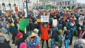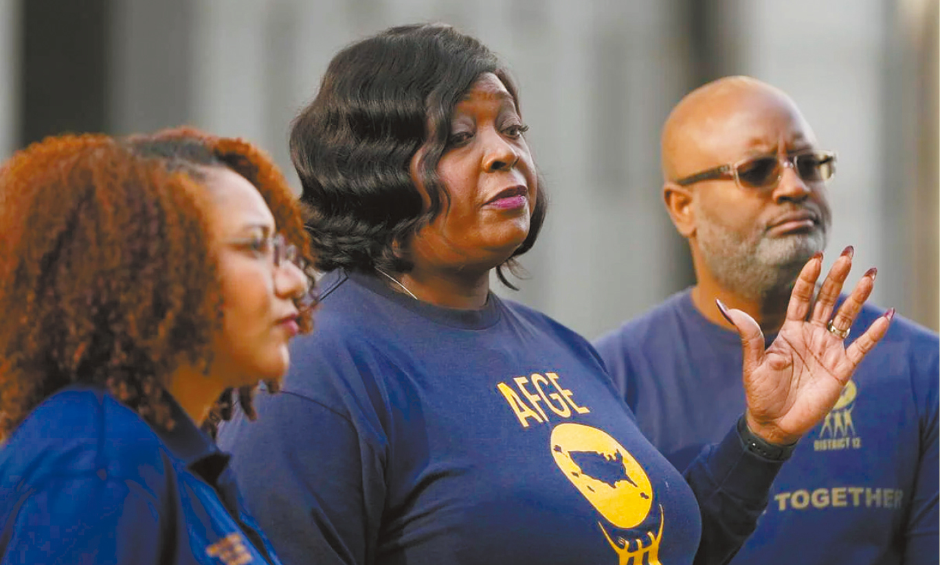 舊金山聯邦地方法官裁定白宮人事管理辦公室沒有合法權力解雇政府部門雇之后,美國政府雇聯合會2110分會主席尼科爾斯(中)表示,裁決是工會的重大勝利。 美聯社