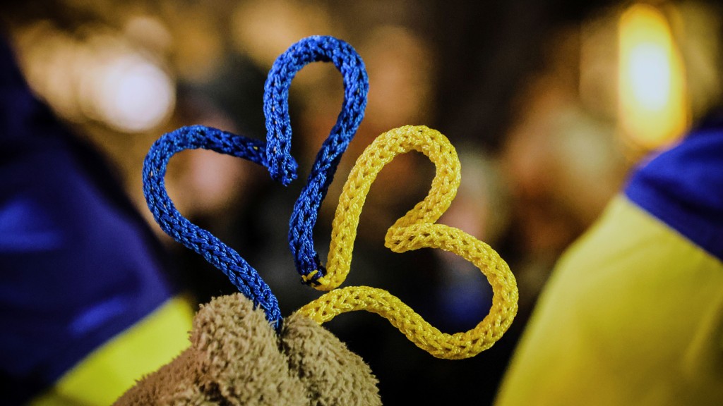 ▲示威者手持烏克蘭國旗顏色的心聲援烏克蘭人。美聯社