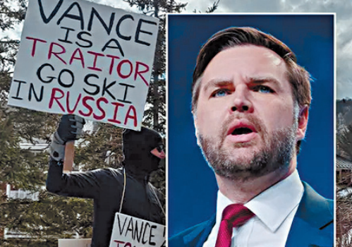 綜合霍士新聞與英國《衛報》報道,數百名示威者1日集結在佛蒙特州沃倫市(Warren)的滑雪度假村,半哩長的人鏈中出現不同標語,指責萬斯是“叛徒”、“納粹敗類”,與總統特朗普一起向俄羅斯總統普京獻媚,因此應去俄羅斯滑雪。