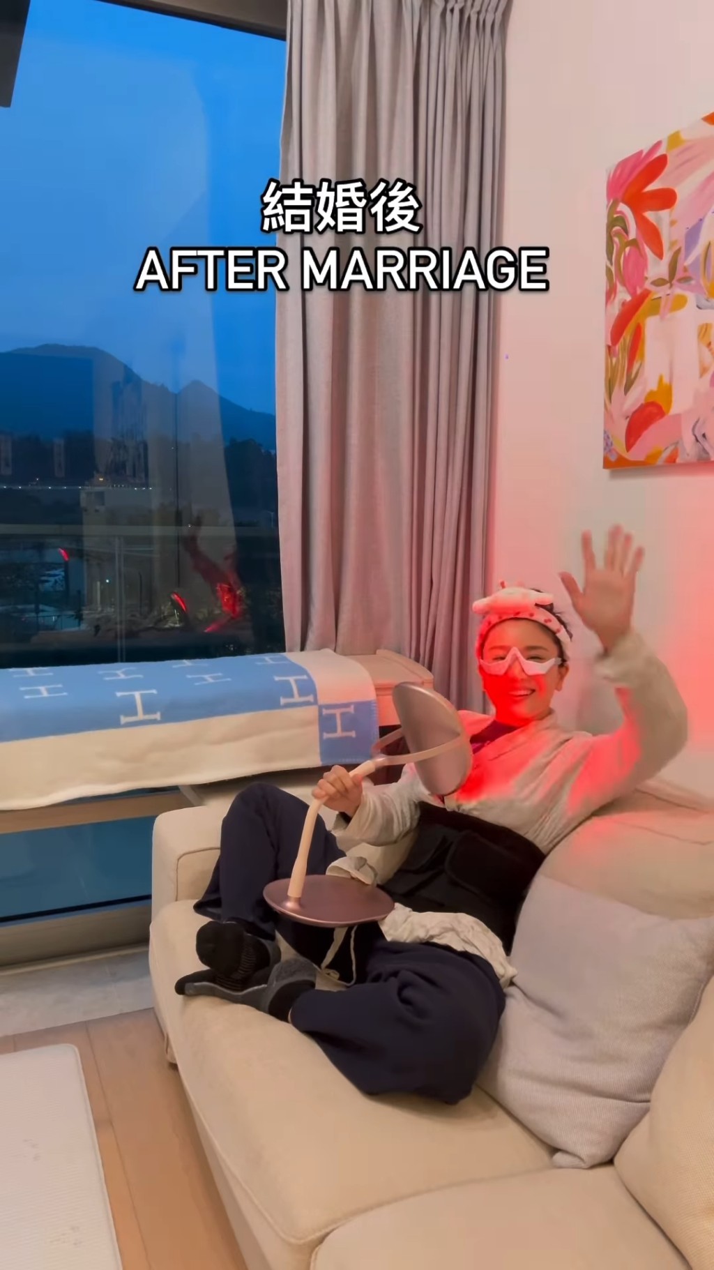 婚后的林芊妤卻是穿上密實居家服,束起頭發,盤膝坐在同一位置照燈護膚,完全有如一個普通師奶。