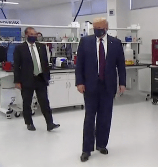 2020 年:特朗普在北卡羅來納州訪問一間實驗室時,被拍到右腿似乎拖曳,步行不穩。