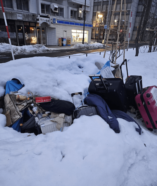 根據日本網民在社交平臺X分享的照片,地點證實為札幌創成川公園,在一片雪地上,堆滿了游客的行李箱,有大有小,彷如一個小型旅行團集體丟棄。此外,行李箱堆上亦滿布垃圾,有空汽水樽、餅罐、紙皮箱禾膠紙卷等,十分影響市容。
