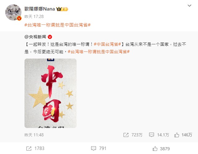 ▲臺灣藝人紛紛轉發央視的“中國臺灣省”圖卡。 微博