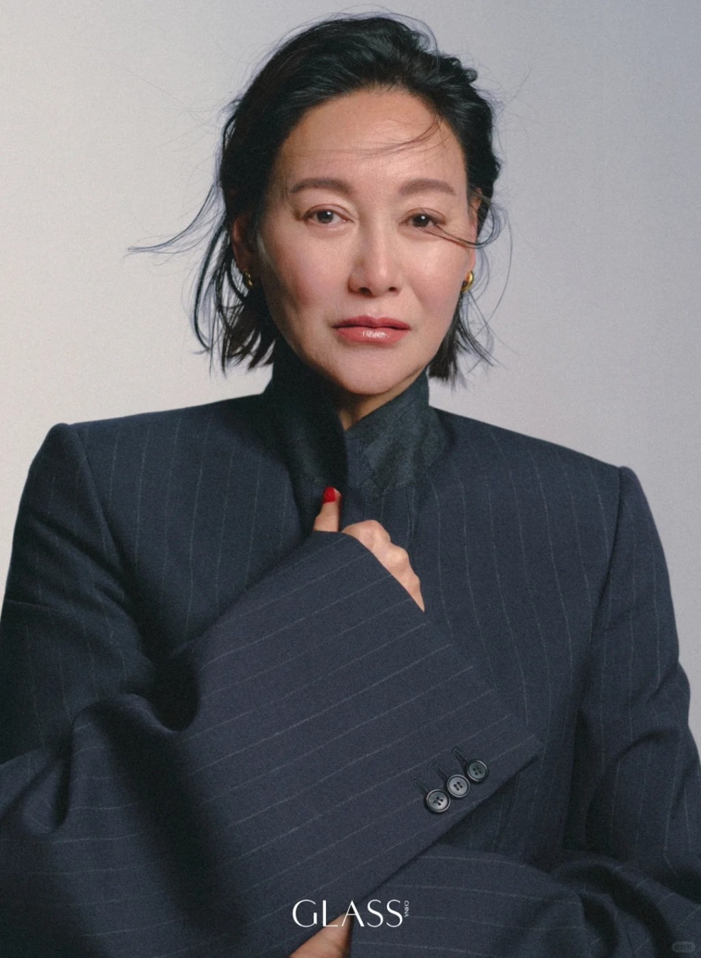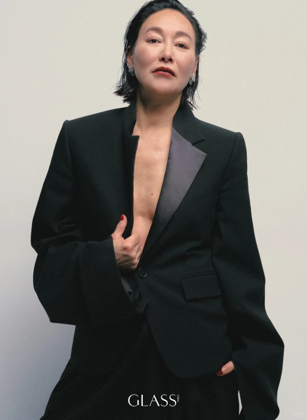 這個國際知名奢侈品牌,剛釋出惠英紅的時尚美照,其中幾張惠英紅真空上陣,外面僅穿一件黑色西裝襤,內里空空如也極盡性感,展現出惠英紅依然保持得極佳的線條與身材。 今輯照片惠英紅行型格路線,故此笑容欠奉,稍濃的妝容配上All Back發型,帶點中性的知性味道。