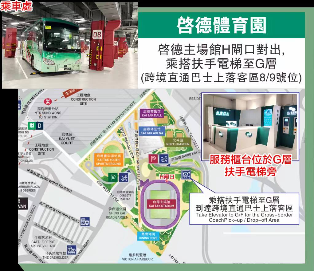 上下客點︰主場館H閘口對出G層跨境直通巴士上落客區8/9號位