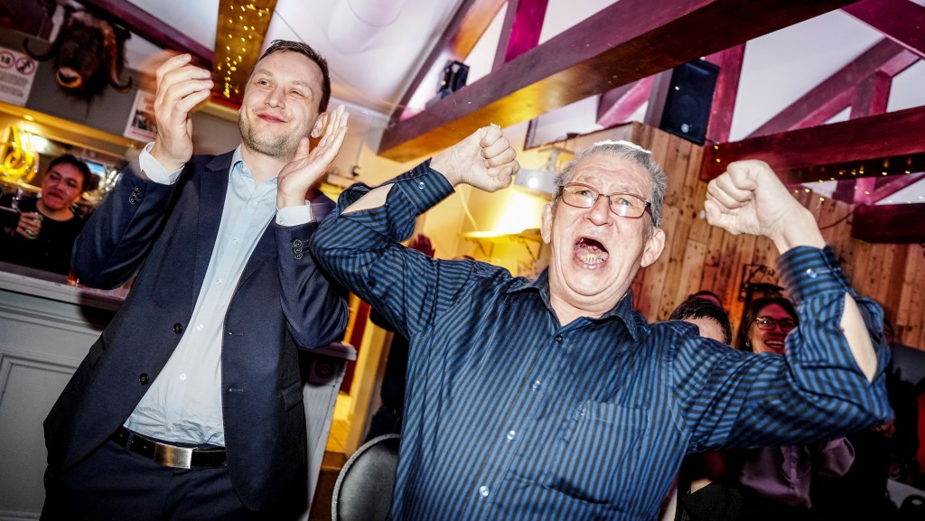 格陵蘭選舉結束,民主黨(Demokraatit)黨魁尼爾森(左)慶祝勝選。 美聯社