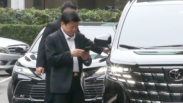 ▲圖為傅崐萁(前)上午看著手機出席國民黨“立院”黨團會議。
