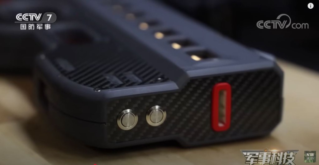 央視軍事日前發放影片,曝光一款電磁槍(“威力可控電磁發射器”),外形方正、握把中置、彈匣在后的電磁槍,採模塊化設計,槍管長約30厘米,重量較輕,可單手持槍。