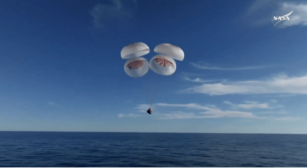 美國航天局的直播畫面顯示,“龍”飛船于美國東部時間18日1時05分(北京時間18日下午1時05分)脫離國際太空站,啟程返回地球。最終,載著太空人的太空艙在計劃原定的當天下午5時57分(北京時間19日5時57分)左右在佛羅里達州附近海域順利濺落。