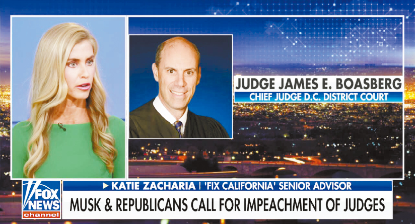 華盛頓聯邦法官博斯伯格(右)是被共和黨國會議員點名彈劾的法官之一,他頒布臨時命令,要求特朗普政府將載有委內瑞拉黑幫移民的飛機飛返美國。 電視截圖