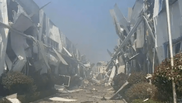 網傳影像可見,整座廠房瞬間“夷為平地”,有如被空襲的戰場。據報事發時突發一聲巨響,隨后冒出濃煙滾滾,伴隨著火光,有當地居民表示,盡管距離發生爆炸的工業園區有幾公里遠,但家中的玻璃仍被震碎。
