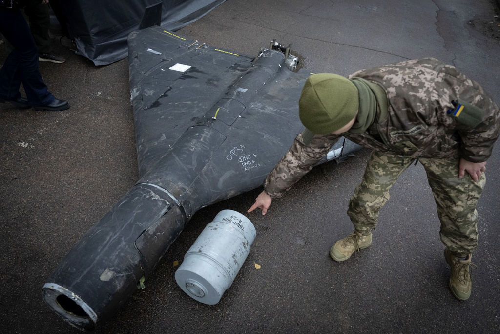 烏克蘭近期發現,俄羅斯在見證者(Shahed)自殺無人機內塞木頭,專家推測俄軍正在測試新硬件,無人機的目標是進行偵察。 圖為遭擊落的俄軍見證者無人機及搭載的熱壓彈頭。美聯社