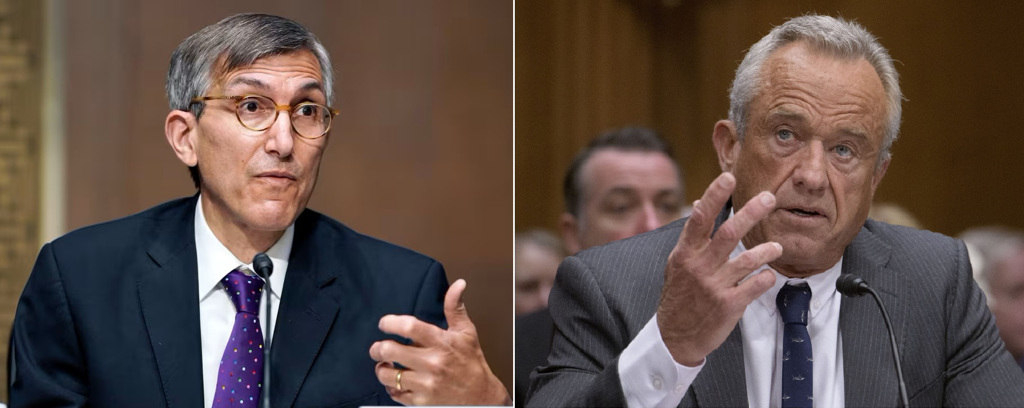 美國FDA首席疫苗專家馬克斯博士(左),因批評衛服部長肯尼迪(右),“持續散布對疫苗的錯誤、撒謊”,被迫自請辭職。美聯社