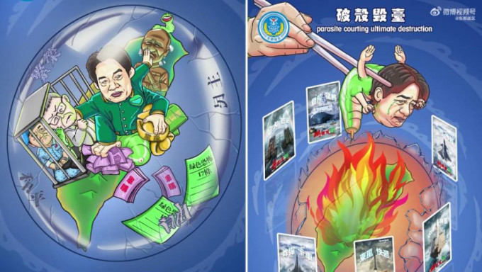 最后畫面出現,“綠蟲”賴清德被筷子夾在半空,下方的臺灣地圖正在燃燒,其后出現6張解放軍軍備的紙牌“圍臺”,再轟出“借殼欺世綠轟沖,倚外謀獨攘內瘋,造孽一家隔兩岸,逆施民主毀繁榮”的文字。