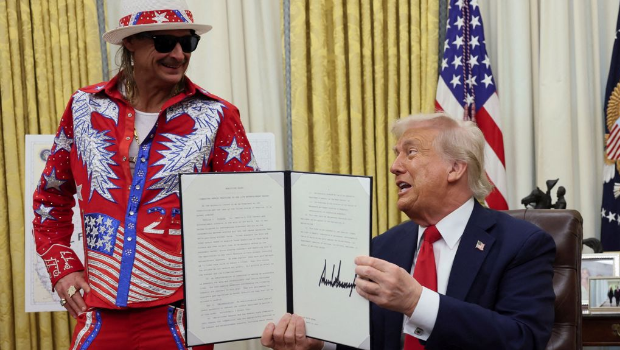 若說這一刻還不夠超現實,那特朗普身旁還站著搖滾嘻哈歌手“搖滾小子”(Kid Rock),只見他一身閃亮的星條旗主題西裝,總統甚至貼心地指出,他“有時被稱為鮑勃(Bob)”。而他到場,是為了強調一項打擊黃牛票販子的新行政命令,以阻止他們藉由拉抬音樂會票價,來剝削粉絲。然而,特朗普思緒已經飄到了更古老的關稅執念上。