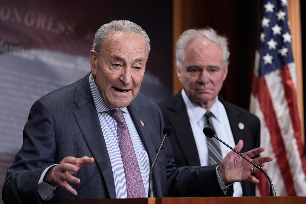 美參議院少數黨領袖舒默(左)在特朗普宣布重大關稅消息前幾小時舉行記者會,抨擊特朗普的關稅“解放日”。