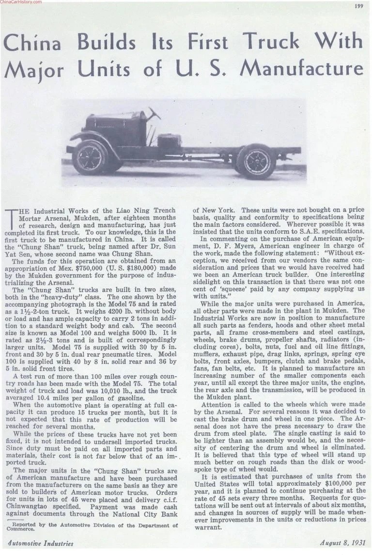 按照“先仿制后創新”計劃,民生工廠入口了一輛美國瑞雪號汽車,以逆向工程,在1931年5月31日,中國首輛汽車——民生75型載貨卡車正式下線,較更為國人熟悉的長春第一汽車制造廠CA10卡車誕生,早了足足25年。
