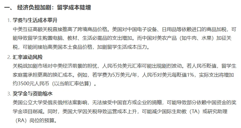 短短一周,中美貿易摩擦迅速升級,這場關稅戰的硝煙味愈發濃烈。在這場激烈的關稅博弈中,赴美留學生又將面臨怎樣的挑戰呢?小編找來Deepseek為留學生們分析一波。