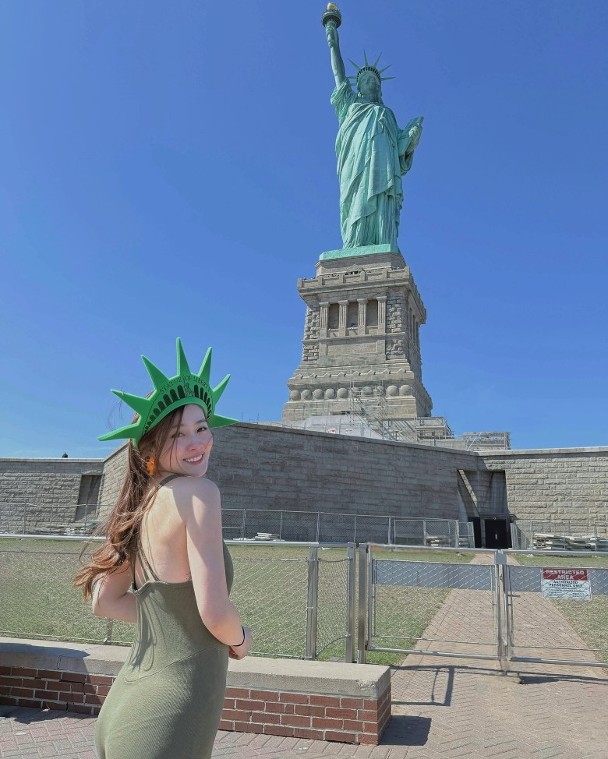 化上淡妝的李蘊披著一頭啡金色微卷長發,頭戴自由女神綠色頭箍,并在5度低溫下身穿軍綠色吊帶修身連身長褲,站在紐約自由女神像景點留影。