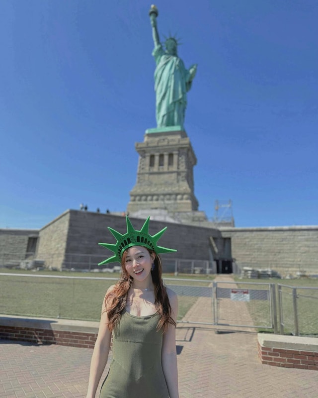 ▲化上淡妝的李蘊披著一頭啡金色微卷長發,頭戴自由女神綠色頭箍,并在5度低溫下身穿軍綠色吊帶修身連身長褲,站在紐約自由女神像景點留影。