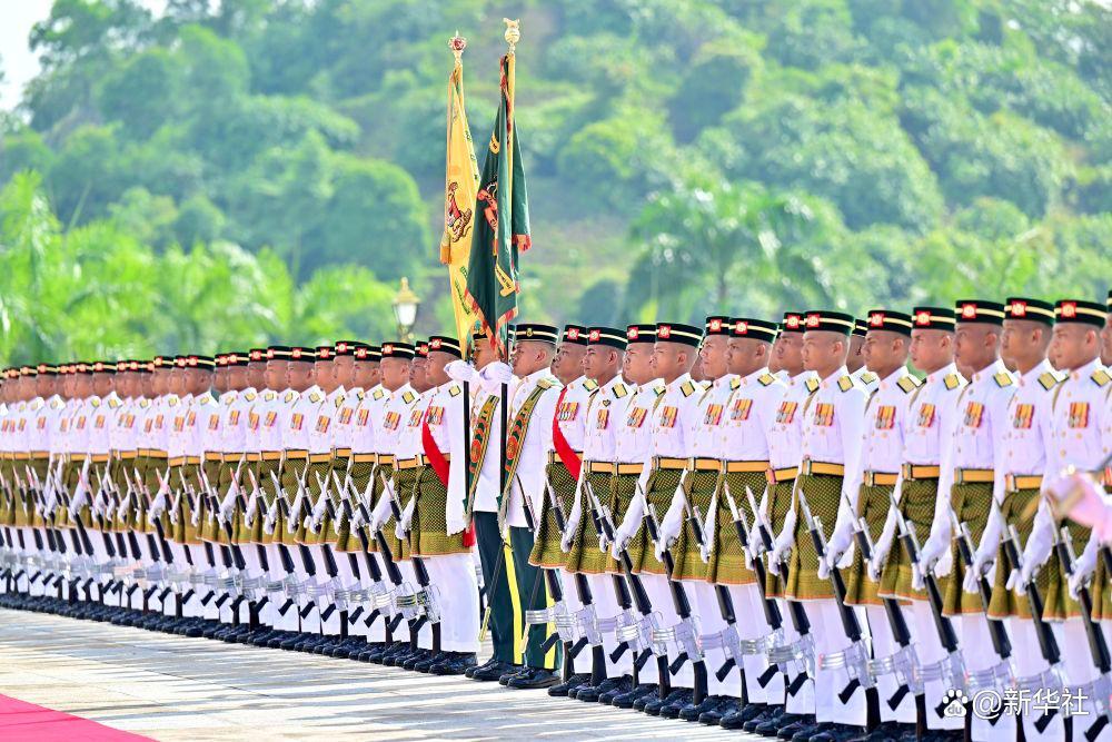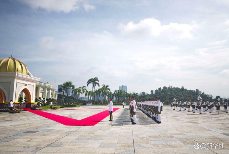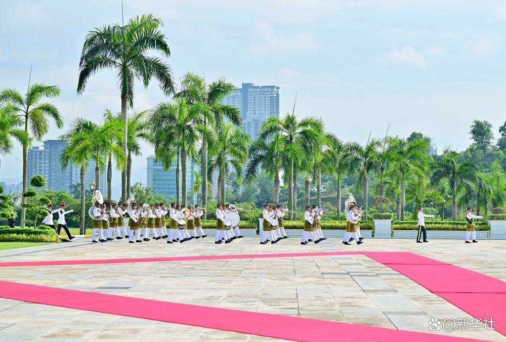 習近平乘車抵達時,易卜拉欣和馬來西亞總理安瓦爾在下車處熱情迎接。兩國元首登上檢閱臺,軍樂團奏中馬兩國國歌,鳴禮炮21響。習近平檢閱儀仗隊。兩國元首進入國家王宮大廳,同雙方陪同人員握手致意。