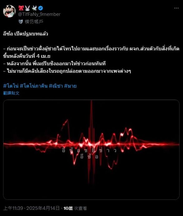 日前社交平臺有爆料指,某人氣歌手背可愛女友出軌,泰國網民隨即憑線索找出爆料主角疑似是拍拖8年的人氣明星情侶Nychaa與Tono。而網上更流傳疑似Tono與女助手的錄音,可聽到疑似Tono的男子指自己沒有幸福感,更大數女友不是,甚至向女助手表白。