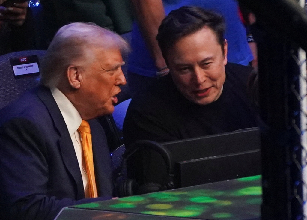 美國總統川普和他的億萬富翁左右手馬斯克13日在美國佛州邁阿密卡西亞中心(Kaseya Center)觀賞 「UFC 314」賽事。(路透)