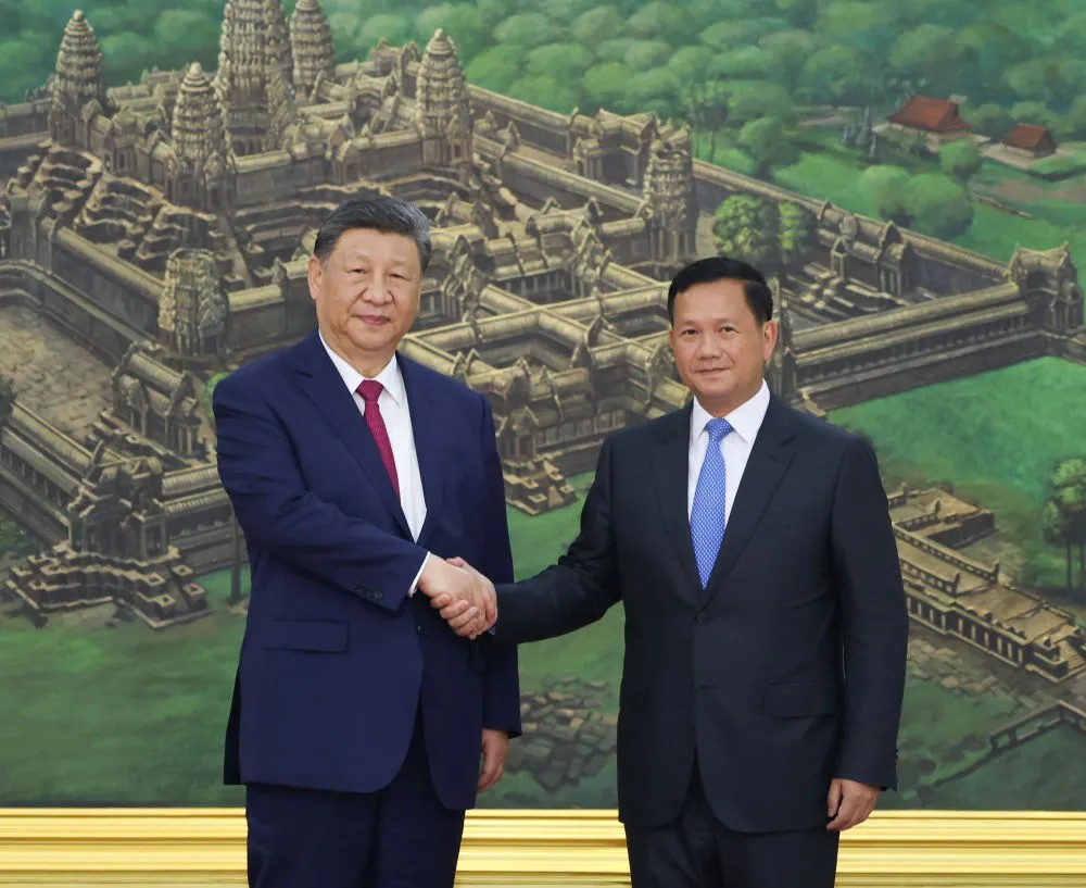 4月17日晚,習近平同柬埔寨首相洪瑪奈在金邊和平大廈舉行會談。?