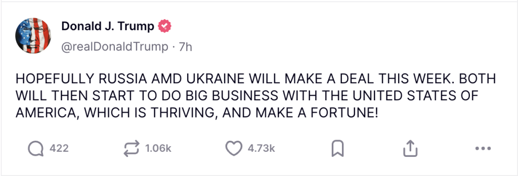 首頁>美國>要聞 特朗普表示希望俄烏本周達成協議,“雙方將與美國做大生意” 發布時間:2025-04-21 08:15 美國總統特朗普周日表示,他希望俄羅斯和烏克蘭在本周達成協議。特朗普在其社交平臺Truth Media寫道:“若達成協議,雙方將與美國做大生意,并賺取巨額財富!”但他未有透露更多細節。▲特朗普在其社交平臺寫道:“雙方將與美國做大生意”。特朗普上任以來,一直推動俄烏?;?,他周五在白宮意有所指地表示,希望盡快達成俄烏?;?,但“如果某一方讓事情變得非常困難”,美國便放棄繼續斡旋。 相關閱讀 俄烏戰爭3周年?| 歐洲多國云集基輔聲援,澤連斯基:冀今年結束戰事 要聞2025-02-25 稱美烏情報共享將恢復,傳特朗普開出2條件恢復軍援 要聞2025-03-10 突發!俄烏發動大規?;ヒu,均稱擊落對方無人機 要聞2025-03-21 俄烏戰爭|俄烏終戰有望,特朗普宣布將在沙特與普京會晤 要聞2025-02-13 特朗普:俄烏問題進展非常好,美烏快將簽署稀土協議 要聞2025-03-21 熱門文章 北理工男教授被曝與男學生發生性關系,校方:情況屬實已開除 特朗普關稅一變再變!傳貿易鷹派官員被邊緣化,現在誰能影響政策? 蔣萬安喊“倒閣”,專家:可凝聚藍渙散士氣 美財長與馬斯克“宮斗”,國稅局代局長上任72小時下臺 解放軍最新單兵作戰大殺器曝光,AI加持可偵察、扔手榴彈 綠營為大罷免不擇手段?徐巧芯警告:這群人100%會投票 2026高雄市長選戰,最支持哪個政黨推出的候選人?街訪結果驚人 奇案解密︱遼寧鋼廠鋼水傾覆,25噸1500度鋼水吞噬32條生命 日本讓步,傳將擴大2種商品進口求美降關稅 鋼鐵大王︱郭從愿撕票案更多細節曝光,同鄉綁匪涉菲國5宗同類案 專題 更多 > 中芯國際上半年營收預計超22億美元,四季度將試產7nm工藝 太興盈喜料多賺逾3倍,指將堅守審慎理財政策 中國移動半年多賺5%,中期息增近6% 清華女學霸創業、一年一融資,鎂佳股份估值9.3億美元沖刺港交所 應收賬款走高,豐沃股份三成收入打“白條” 惠科股份IPO:獲政府補助超53億,向實控人堂弟采購超8億 關稅戰|白宮:特朗普簽行政命令,對華關稅暫緩期再延長90日 高盛:64%關稅成本由美企“買單”,消費者僅承擔22% 美媒:特朗普政府通過關稅施壓,要求買美國軍火