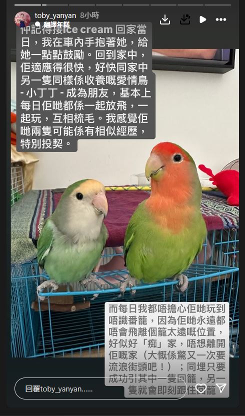 陳庭欣今日在IG宣布愛情鳥“ice cream”昨日突然離開,陳庭欣憶述兩人多年相處經過,她說:“2018年某一個下午,收到一位女士嘅DM,話喺元朗拾獲一只橙色頭嘅愛情鳥,身體瘦削,仲被附近的貓咪欺負唔識點處理,所以問我點算。當時我嘗試教佢點樣先安置好雀雀,同時即刻上各大鸚鵡群組發帖希望搵番主人。雖然嗰位女士都好想幫忙暫養雀雀,可惜因為無經驗同家中有小孩,不方便暫托或收養,于是我就接咗雀雀到我家中暫住,一邊繼續幫佢搵番主人,可惜過了很久主人都無出現過。最后我決定收養牠,拾獲嗰位女士嘅小女兒幫雀雀改咗個名,叫 Ice Cream?!标愅バ婪QIce Cream適應得很快,與另一只愛情鳥小丁丁成為朋友。