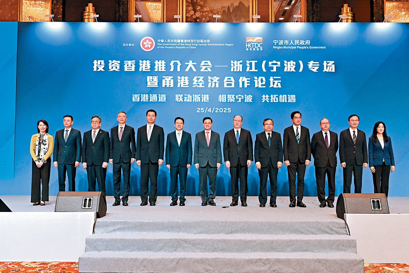 李家超在寧波出席投資香港推介大會—浙江(寧波)專場暨甬港經濟合作論壇,與周霽、浙江省副省長盧山及寧波市委書記彭佳學等嘉賓合照。
