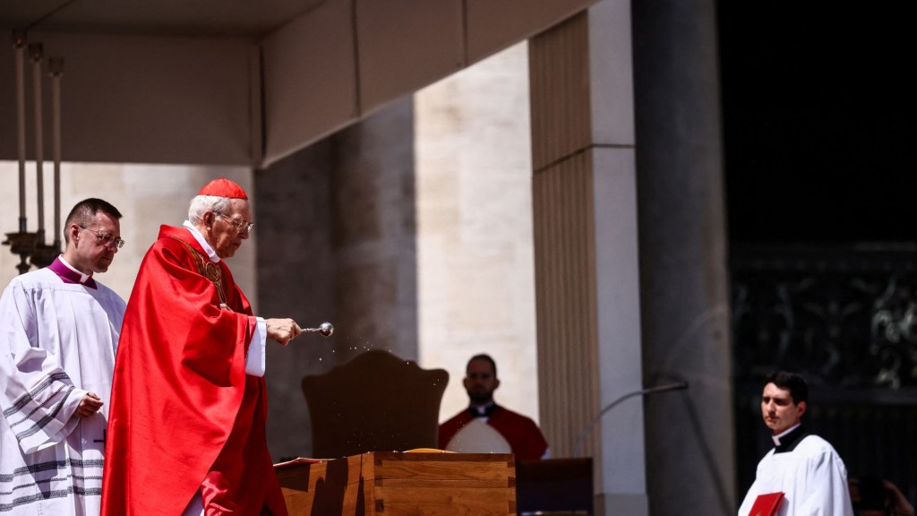 ▲葬禮結束前,雷樞機主教灑圣水祝福。 路透社