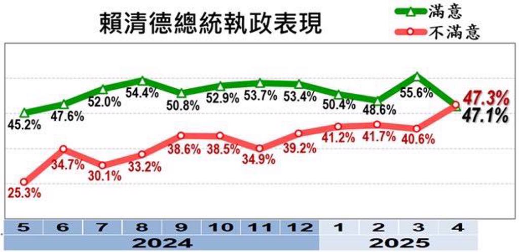 根據美麗島電子報民調,賴清德執政滿意度出現死亡交叉。
