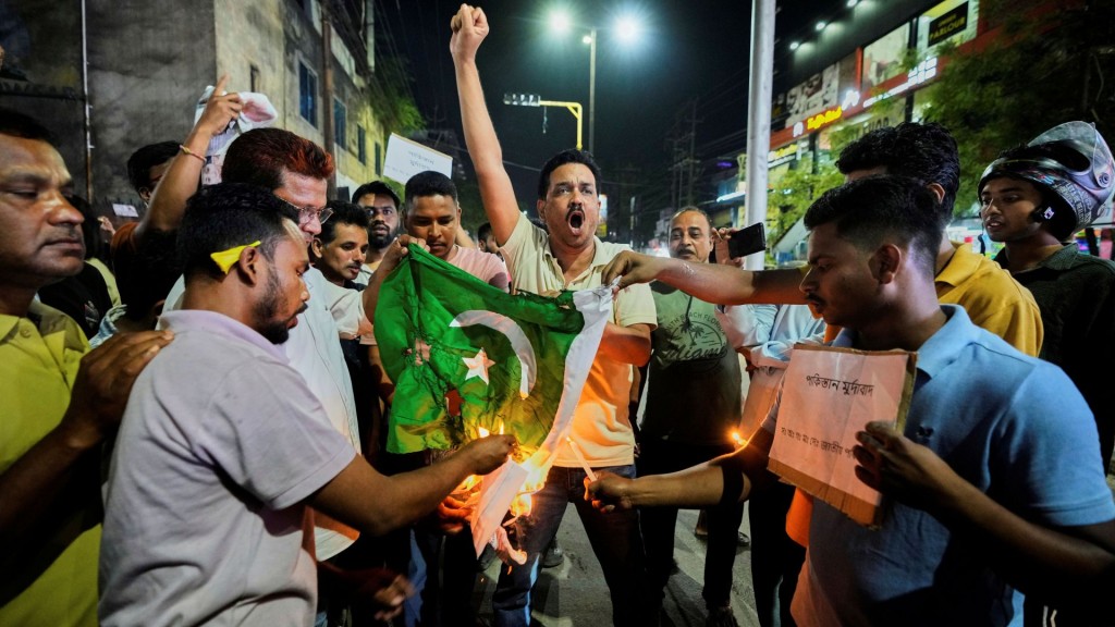 ▲印度古瓦哈提民眾焚燒巴基斯坦國旗,抗議武裝分子殺害游客。美聯社