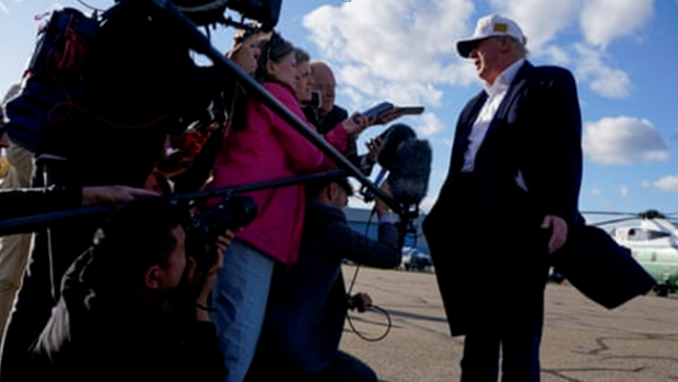 ▲當地時間27日,特朗普在美國新澤西州莫里斯敦市一機場登機前向記者發表講話 圖源:外媒報道配圖
