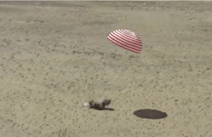 ▲神舟十九號載人飛船返回艙主傘已經打開,即將著陸東風著陸場。