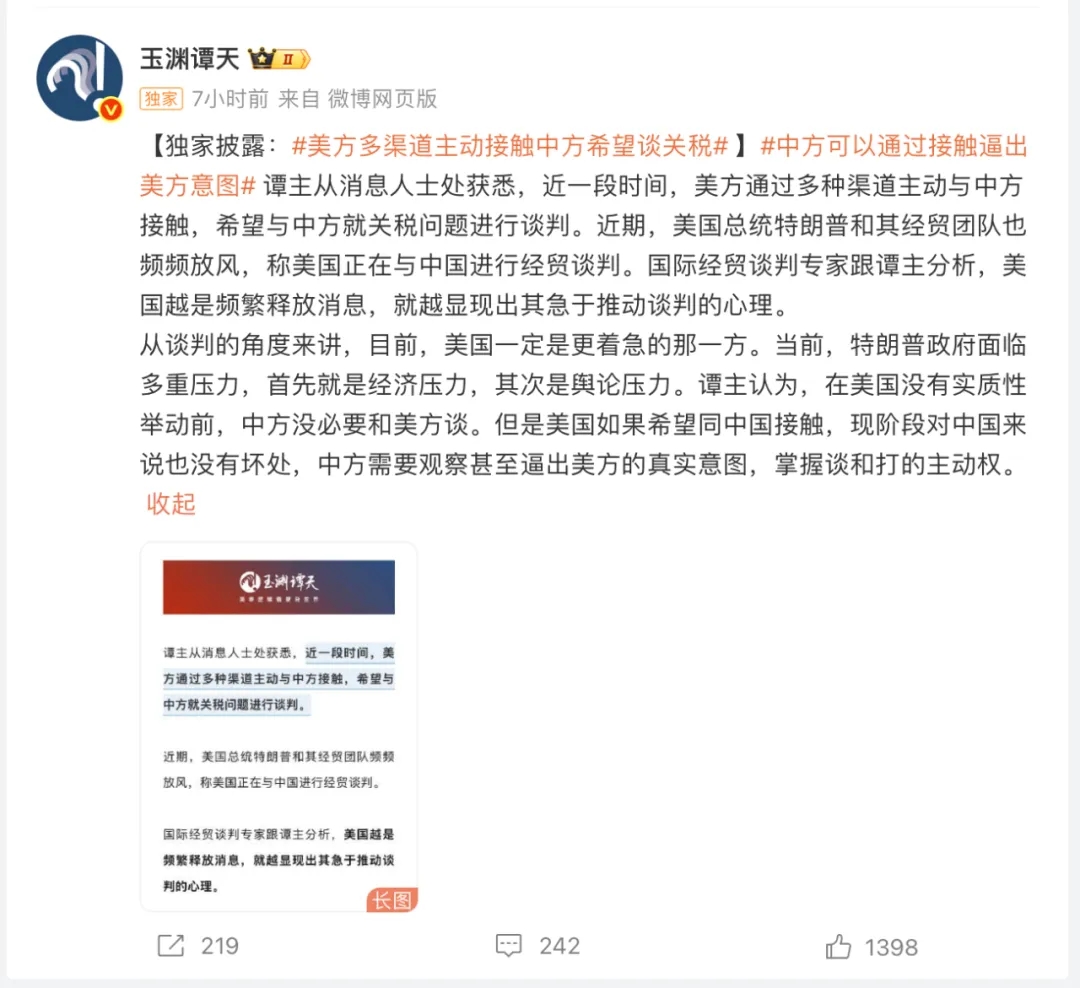 據@玉淵譚天 消息,譚主從消息人士處獲悉,近一段時間,美方通過多種渠道主動與中方接觸,希望與中方就關稅問題進行談判。近期,美國總統特朗普和其經貿團隊也頻頻放風,稱美國正在與中國進行經貿談判。國際經貿談判專家跟譚主分析,美國越是頻繁釋放消息,就越顯現出其急于推動談判的心理。