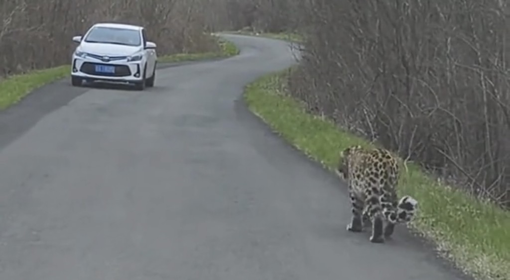 網上視頻顯示,一輛汽車行駛在鄉村道路,前方路段一只威風凜凜的東北豹正沿著路邊淡定踱步,其間車內一名男子向著窗外的東北豹喊話:“大哥讓讓道,我要回家?!彪S后這只豹子拐下路面,隱入路旁的山林之中。