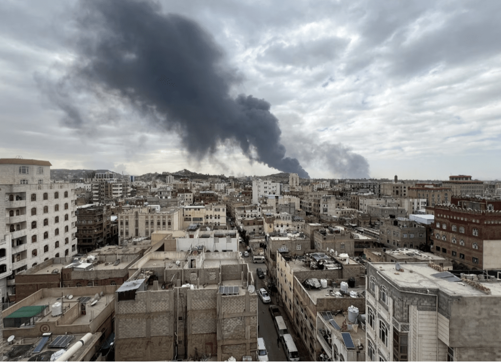 ▲2025年5月6日,以色列空襲也門薩那胡塞武裝基礎設施后,濃煙滾滾。路透社