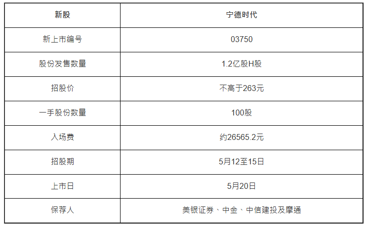 電池龍頭股寧德時代(3750)由今日(12日)起至周四(15日)招股,擬發行1.18億股H股,7.5%在港公開發售,而且招股書列明「毋須受任何回補機制所規限」,招股價不高于263元,集資最多約310億元,每手100股,入場費26,565.24元,預期于5月20日掛牌,美銀證券、中金公司及中信建投及摩根大通為聯席保薦人。 此外,寧德時代A股(300750)截至上周五報248.27元人民幣(約266.8港元),即招股價較A股折讓僅約1.4%; 不過,該A股今日最新收報257元人民幣(約276.7港元),換言之,招股價暫時較A股折讓僅約5%。