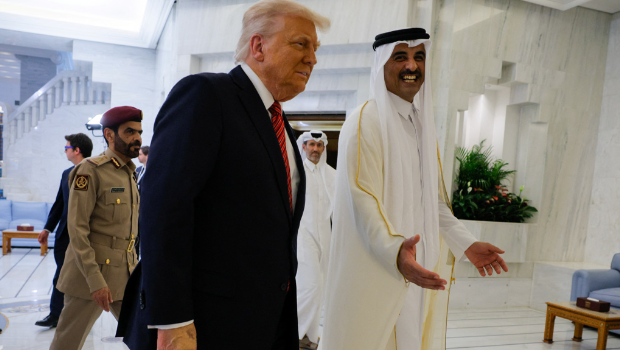特朗普14日抵達卡達訪問,國王塔米爾親自迎接。