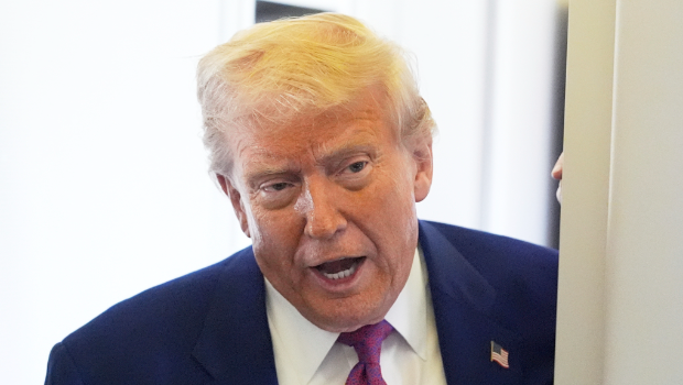 ▲美國總統特朗普15日在空軍1號專機上對媒體記者發表談話的神情。(美聯社)