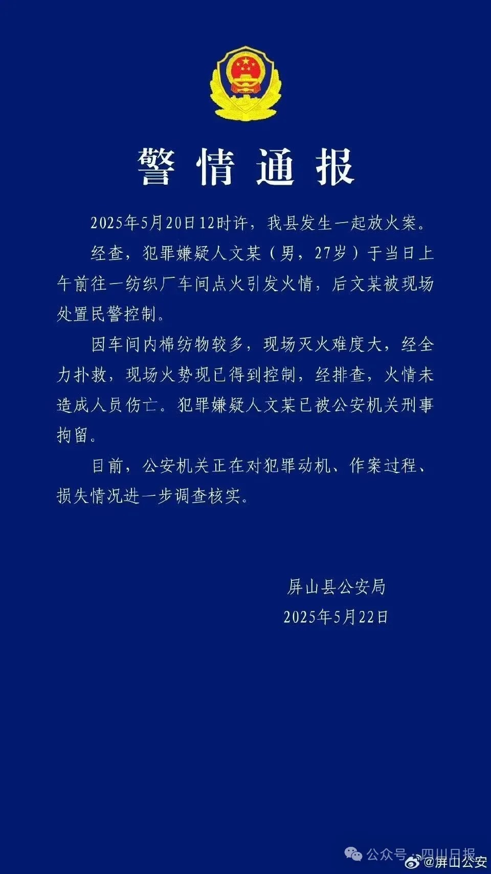 22日當地警方發通報,指27歲文某,涉嫌在一間紡織廠車間點火,引起火災。民警到場將疑犯控制。警方指,事件未造成傷亡,疑犯已被刑事拘留,正調查其作案動機及核實損失。