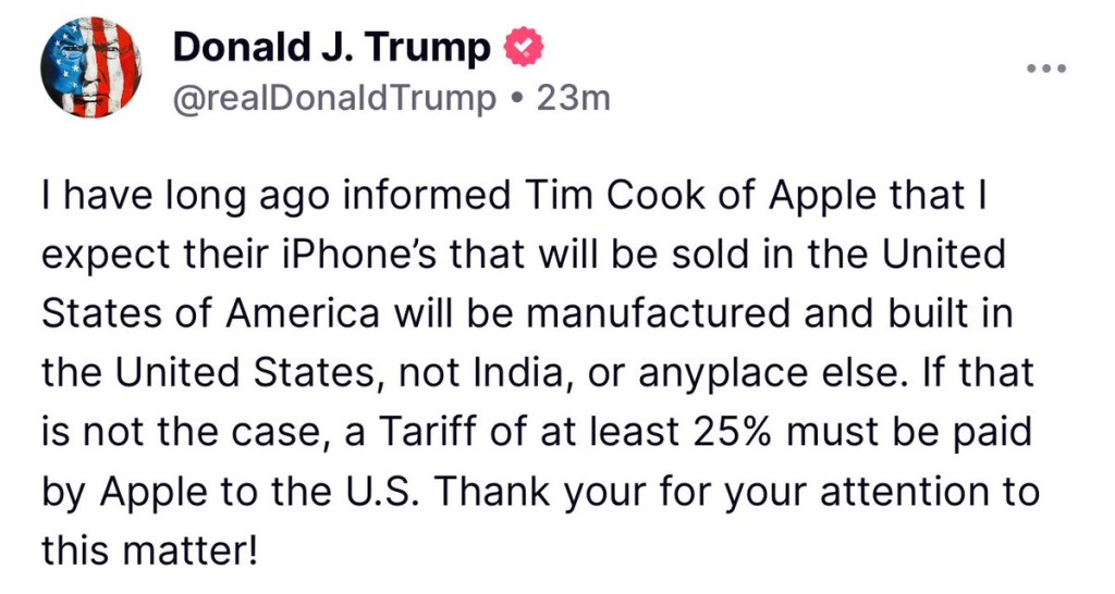 特朗普在Truth Social發文說:“我老早就告訴蘋果公司的庫克,我希望他們在美國販售的iPhone是產自美國工廠,而非印度或其他任何地方。若不符合這一點,蘋果必須向美國繳納至少25%的關稅。感謝各位關注此事!”